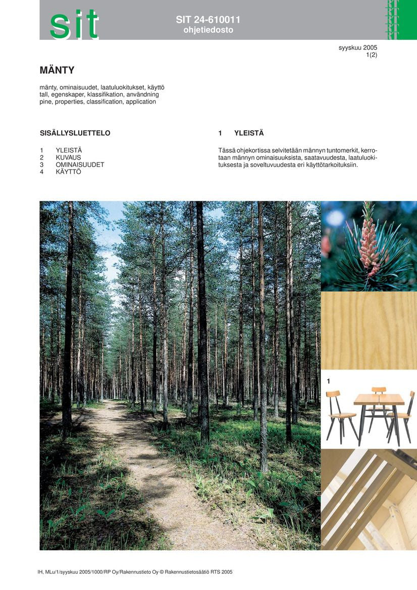 Tässä ohjeessa selvitetään männyn tuntomerkit, kerrotaan männyn ominaisuuksista, saatavuudesta, laatuluokituksesta ja soveltuvuudesta eri käyttötarkoituksiin.