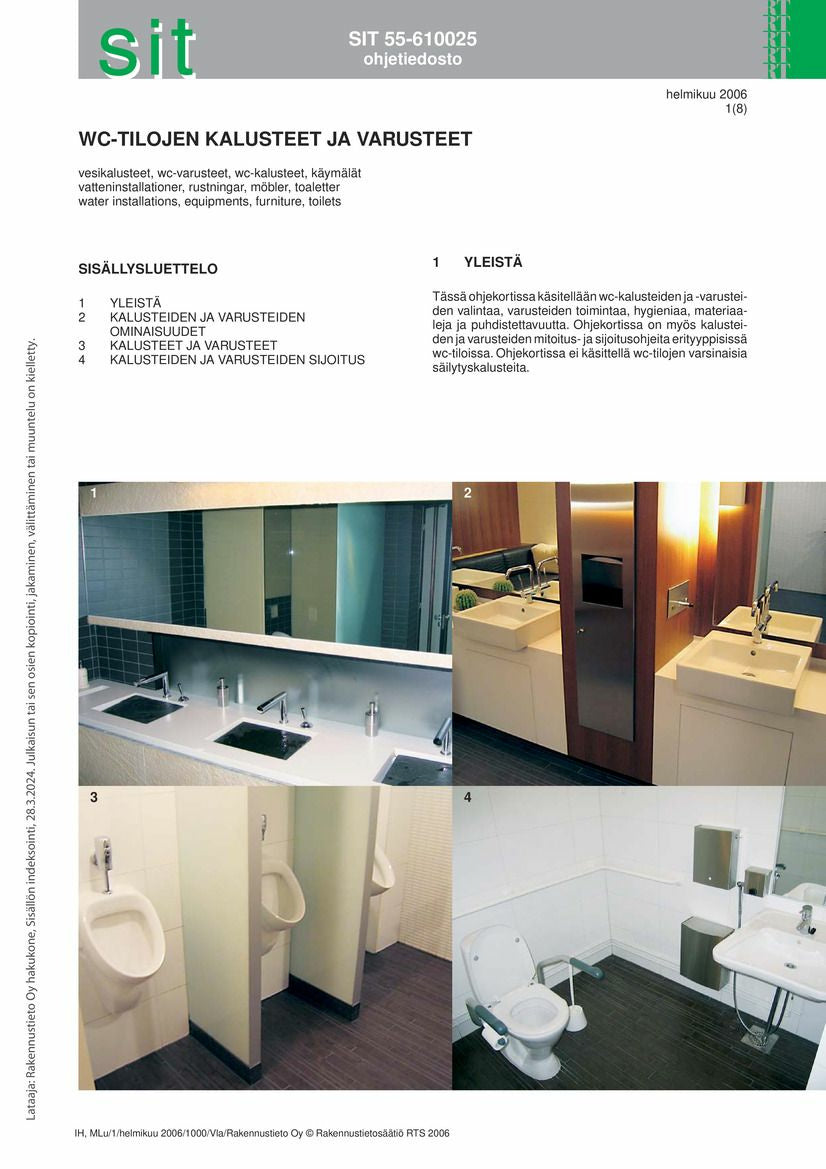 1. YLEISTÄ, 2. KALUSTEIDEN JA VARUSTEIDEN OMINAISUUDET, Käyttö, Kalusteiden ja varusteiden valinta, 3. KALUSTEET JA VARUSTEET, Wc-istuimet, Pesualtaat, Wc-paperitelineet, Saippua-annostelijat, Pyyheannostelijat ja käsien kuivauslaitteet, Roska-astiat, 4. KALUSTEIDEN JA VARUSTEIDEN SIJOITUS. USEAN WC-HUONEEN WC-TILA, LIIKUNTAESTEISTEN WC:T.