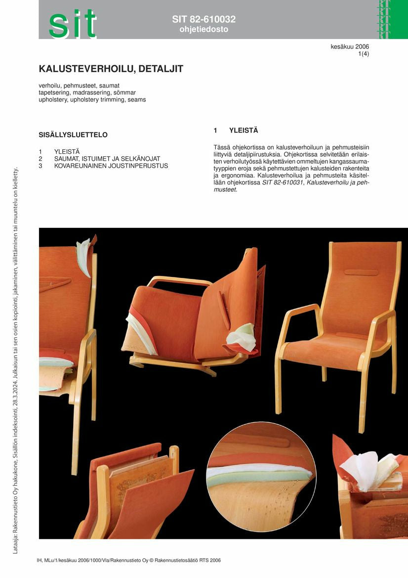 - Avainsanat tuolit; sisustustuotteet; verhoilutarvikkeet; istuimet; kalusteverhoilu; kovaperustus; kovareunainen joustinperustus; pehmusteet; selkänojat; harjasauma; kaksipuoleinen tuettu sauma; katesauma; satulavyöpunos; saumatyypit; tere; yhdyssauma