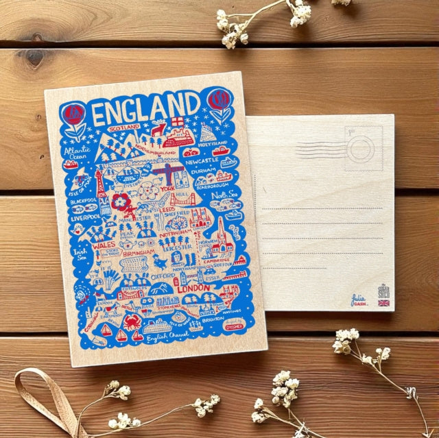 Julia Gash Wooden Postcard - England. Our beautiful wooden postcards are made in the UK, printed on sustainable, FSC certified birch. Featuring some of England's most iconic cities and beautiful landscapes, illustrated by Julia in her spirited handwriting. Lue lisää