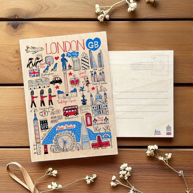 Julia Gash Wooden Postcard - London. Our beautiful wooden postcards are made in the UK, printed on sustainable, FSC certified birch. Featuring some of the UK's most iconic cities and beautiful landscapes, illustrated by Julia in her spirited handwriting. Lue lisää