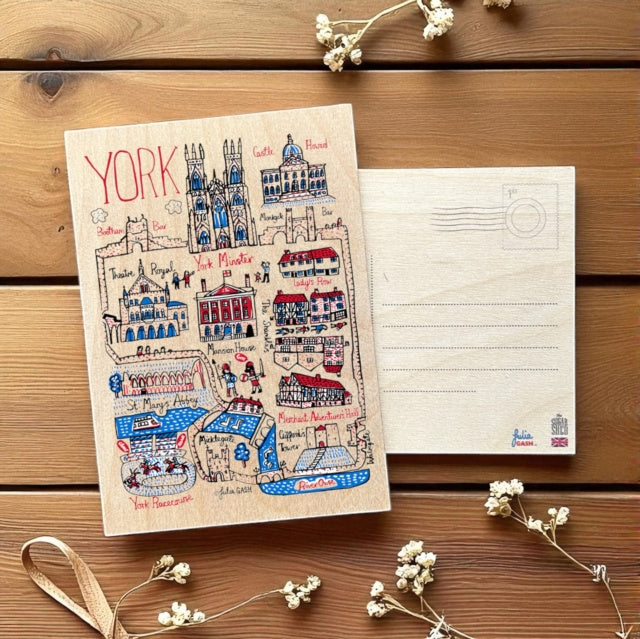 Julia Gash Wooden Postcard - York. Our beautiful wooden postcards are made in the UK, printed on sustainable, FSC certified birch. Featuring some of the UK's most iconic cities and beautiful landscapes, illustrated by Julia in her spirited handwriting.