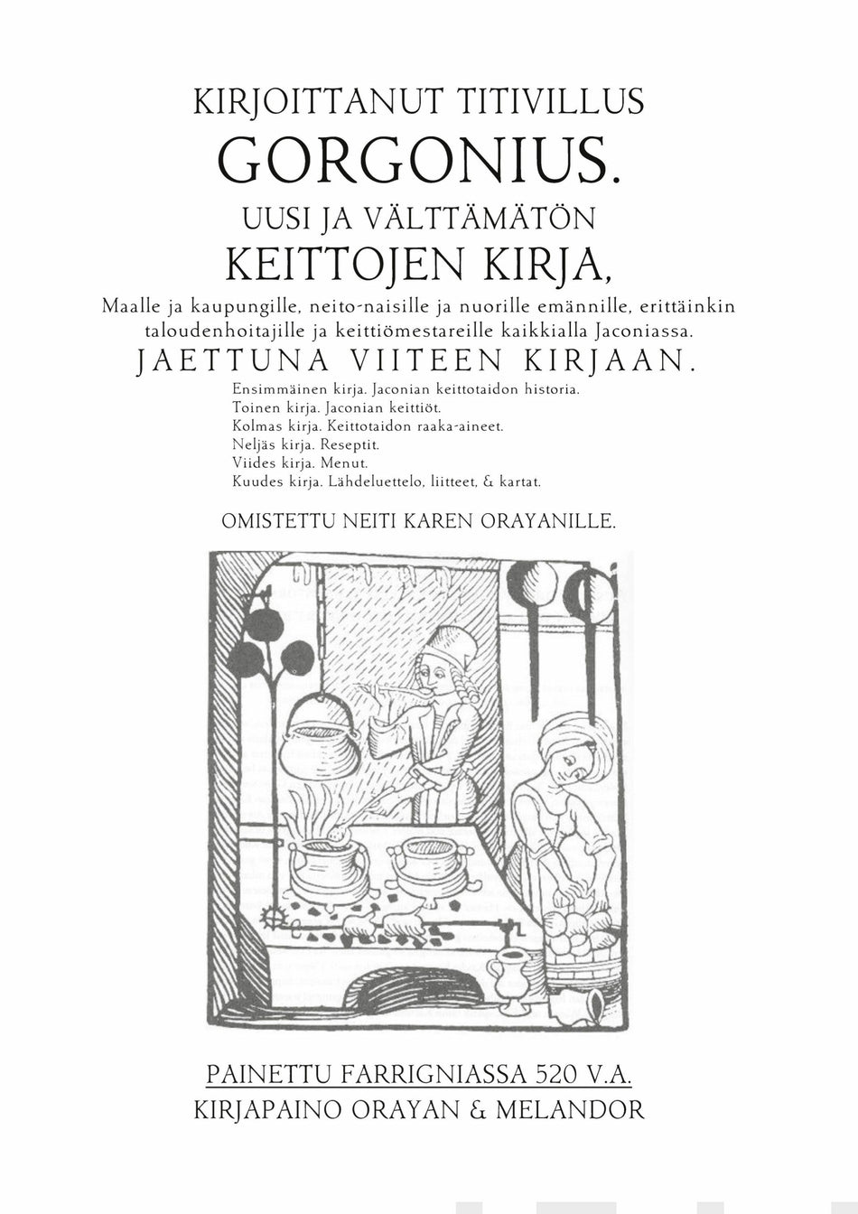 • Avainsanat ruoanvalmistus; Praedor; fantasiasarjakuvat; Fantasia; ruokakulttuuri; fiktiiviset paikat; keittokirja; ruokalistat; Jaconia; Roolipelit
