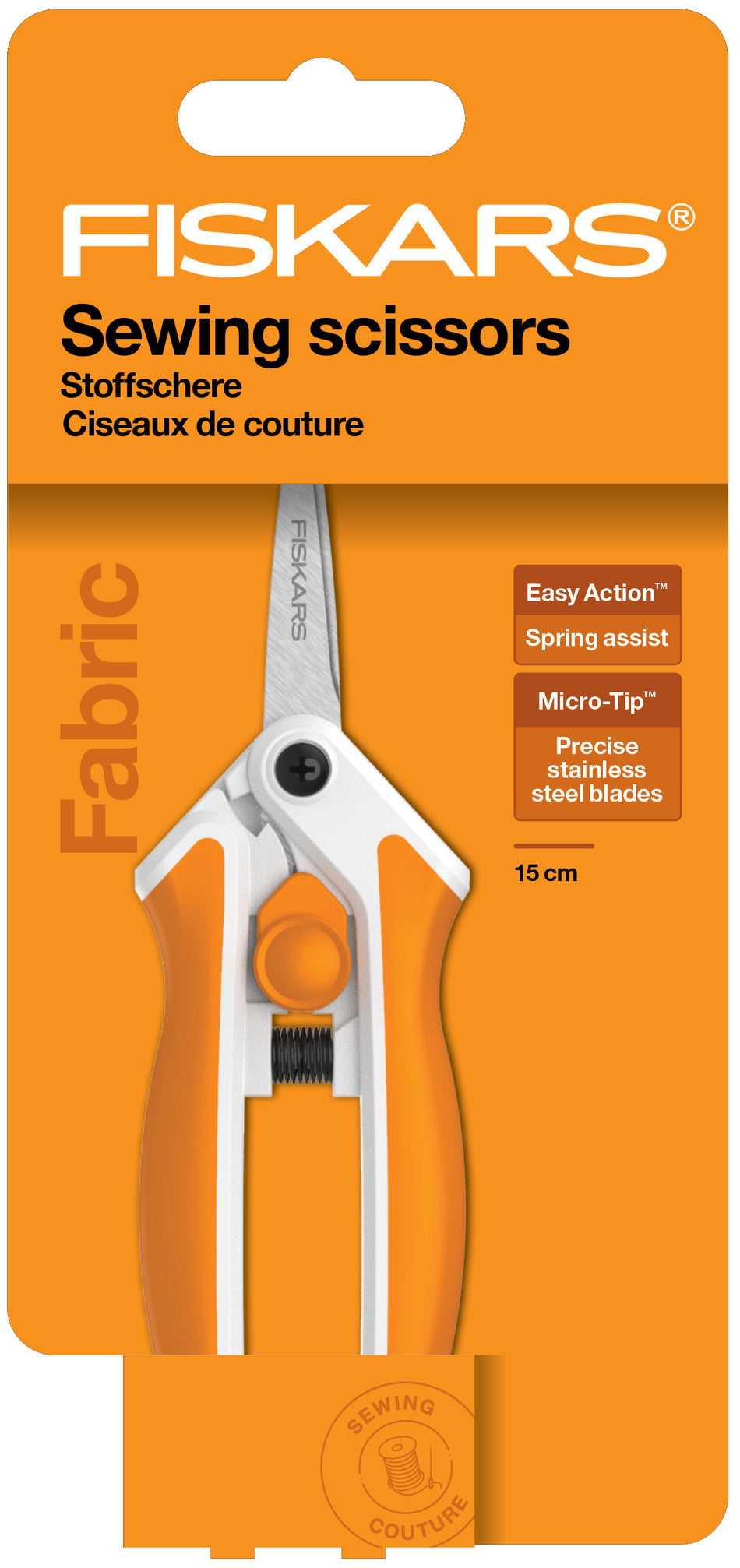 Fiskars Easy Action™ -kangassakset 15 cm mahdollistavat luovuuden haastaviakin yksityiskohtia ja kuvioita leikatessa. Lisäksi niissä on jousimekanismi, joka ehkäisee käden rasitusta. Ensiluokkaiset, ruostumattomasta teräksestä valmistetut terät pysyvät terävinä pitkään. Saksien MicroTip-terien kärjet sopivat vaativienkin yksityiskohtien ja kuvioiden leikkaamiseen. Easy Action™ -jousimekanismi avaa terät automaattisesti leikkaamisen päätteeksi, mikä vähentää pitkäkestoisesta työskentelystä johtuvaa käden rasitusta. Softgrip™-kahva tarjoaa käyttömukavuutta ja hallinnan tuntua sekä oikea- että vasenkätisille ompelijoille. Peukalolla käytettävä lukitusmekanismi lukitsee terät tehden saksien säilytyksestä turvallista. Valitse sinäkin Fiskarsin sakset tarkkuutta vaativiin ompeluprojekteihin.