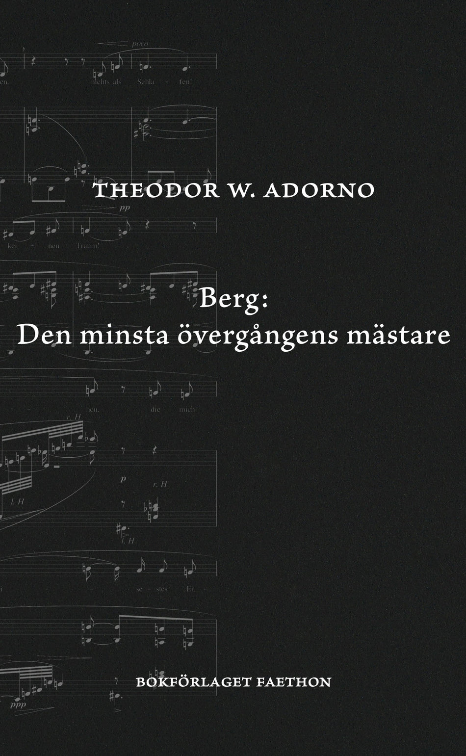 Berg: Den minsta övergångens mästare, publicerad 1968, är Adornos sista bok. Den återspeglar en mer än tre decennier lång utveckling som utmynnar i den nya analys av den moderna musikens utveckling som tar form under 50-talet och slår igenom i hans omvär­deringar av Wagner, Stravinskij och Mahler. Hos Berg finner Adorno en teknik för den »minsta övergången« som strävar tillbaka till det infinitesimala och amorfa, till intet, och i ett intensivt dödsmed­vetande vill gestalta sitt försvinnande. I den »informella musik« som Berg utvecklar står det samtida och framtida komponerandet på spel. Denna musik vore ett nedstigande i kroppsliga impulser som ska skapa en yttersta täthet, och som visar på en möjlighet som för Adorno i dag ännu inte realiserats.  Theodor W. Adorno (19031969) var en av de ledande filosoferna inom Frankfurtskolan. Tillsammans med Max Horkheimer skrev han Upplysningens dialektik (1947). Han räknas till en av 1900-talets viktigaste filosofer och ägnade en väsentlig del av sin filosofi åt estetiska frågor, inte minst skrev han om musik. Översättaren Sven-Olov Wallenstein är professor i filosofi vid Södertörns högskola. Han har överfört en lång rad filosofiska verk från italienska, tyska och franska till svenska, däribland sju böcker av Adorno. Han är också författare till studien Adornos musik.