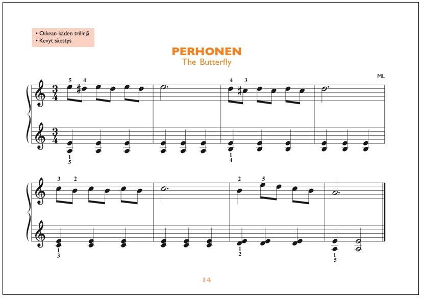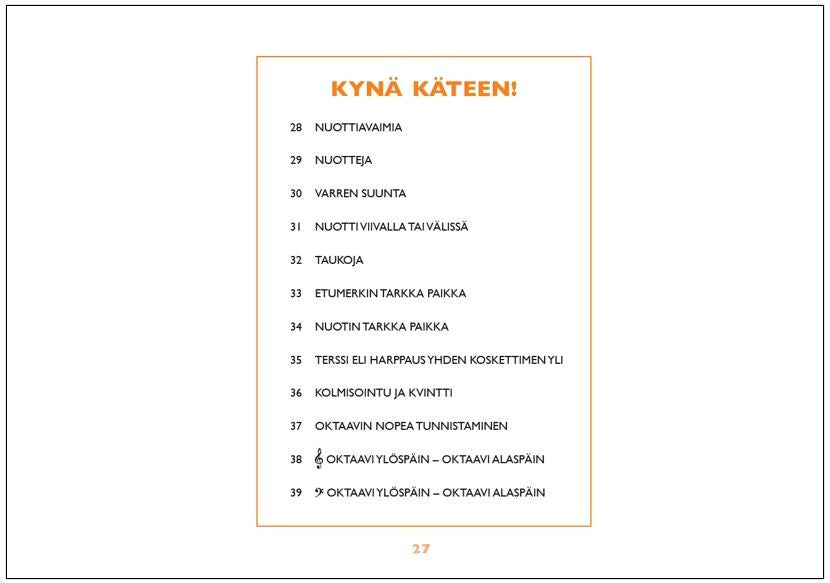 Soittotehtävissä harjoitellaan peruskuvioita, kolmisointua käännöksineen ja erilaisia kosketustapoja. Kappaleet ovat enimmäkseen 5-sormiasemissa ja ...