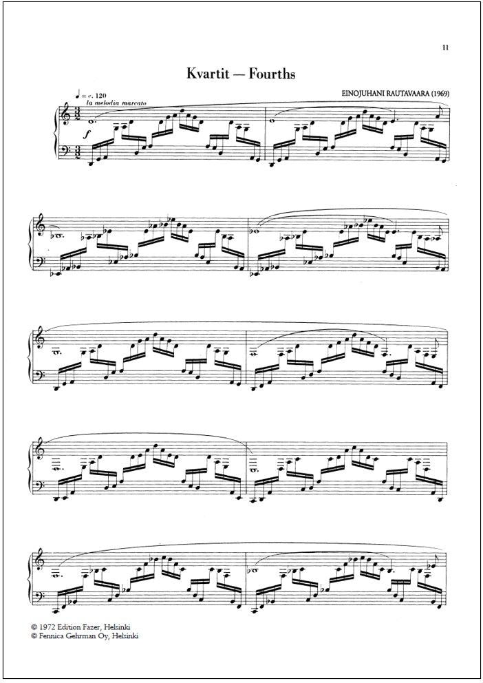 Rautavaara's Etudes are presented as a series of interval studies, the various intervals providing a distinct colouring to the music. According to the composer's wife Sini Rautavaara: "Each interval seems to want to behave in a certain way, to adopt a certain value, to create a certain ambience: the brilliant, egoistical 'Thirds', the 'Sevenths' vainly seeking rest, the anxiously vague 'Tritones'; the 'Fourths' like forces of nature; the expressive 'Seconds', and the airily rhythmic 'Fifths'.