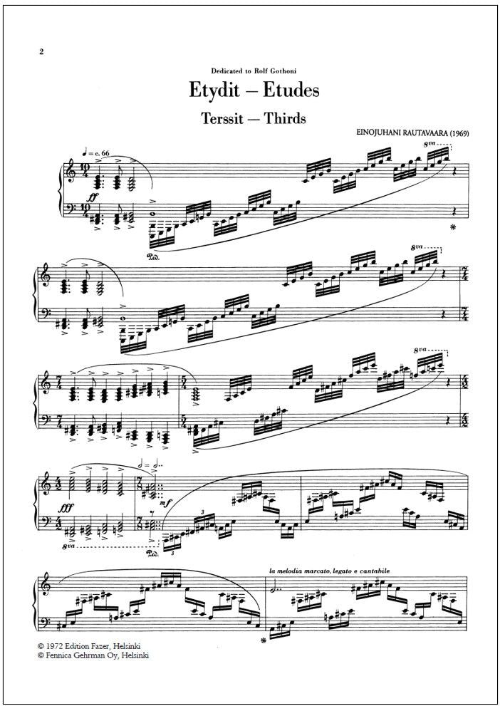 Rautavaara's Etudes are presented as a series of interval studies, the various intervals providing a distinct colouring to the music. According to the composer's wife Sini Rautavaara: "Each interval seems to want to behave in a certain way, to adopt a certain value, to create a certain ambience: ... Lue lisää