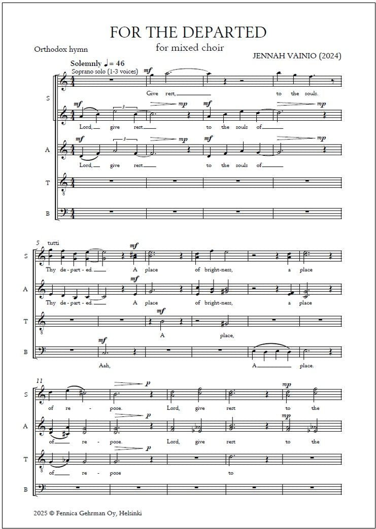 Commissioned and premiered 2nd November 2025 by the Krysostomos Chamber Choir, Jennah Vainio's For the Departed for mixed choir (2024) is a rhytmic, powerful prayer, concluding with the harmonies of the heavenly gates of the otherworldly spheres. The text (in English) is an Orthodox hymn used as ... Lue lisää