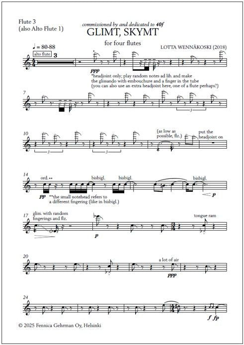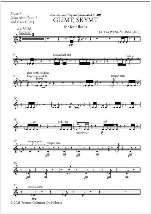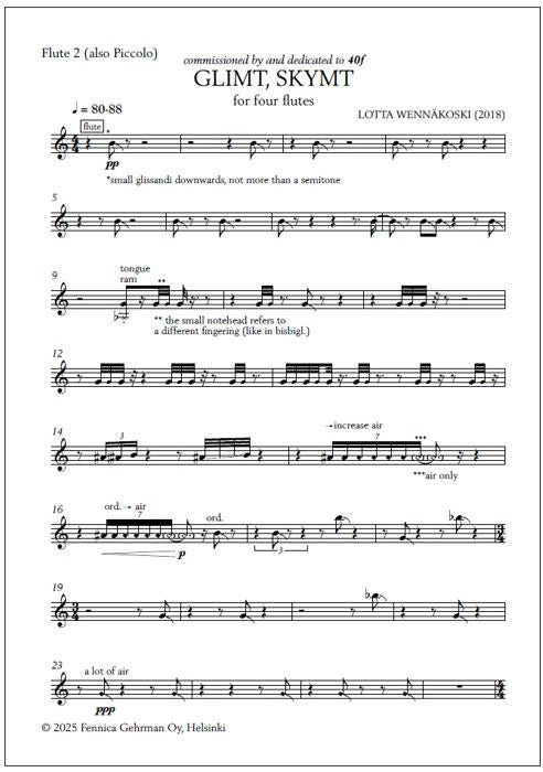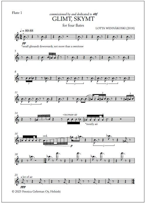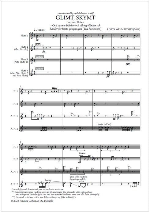 The score of Lotta Wennäkoski's Glimt, skymt [Swedish for "Glimpse, glance"] for four flutes opens with a citation from Tua Forsström, a Finland-Swedish writer: "Och vattnet blänker och allting blänker och/ händer för första gången igen" ("And the water is sparkling and everything is sparkling an... Lue lisää