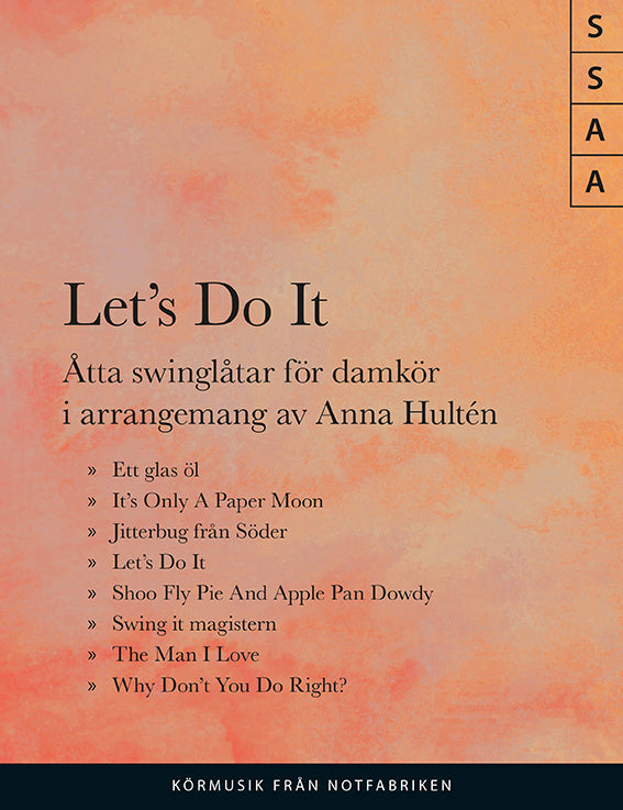 Åtta swinglåtar i arrangemang för damkör av Anna Hultén: Ett glas öl (SSA), It's Only A Paper Moon (SSA), Jitterbug från Söder (SSAA), Let's Do It, Let's Fall In Love (SA), Shoo Fly Pie And Apple Pan Dowdy (SA), Swing it magistern (SSA), The Man I Love (solist + SSA) och Why Don't You Do Right (S... Lue lisää
