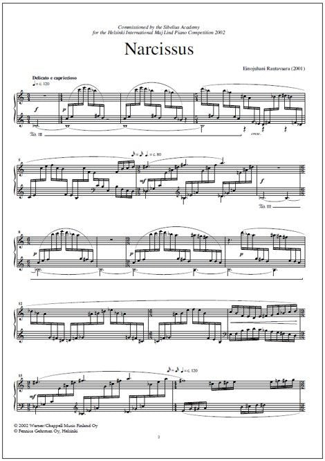 EInojuhani Rautavaara's Narcissus (2001 was commissioned by the Sibelius Academy for the 2002 Maj Lind Piano Competition. According to the composer, this work turned out to be so much a mirror game with virtuosic motifs that the only correct name for it was Narcissus. "...