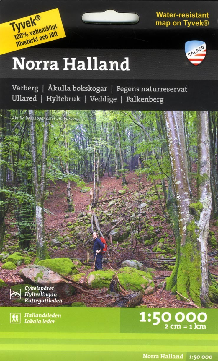 Vi har utvecklat två kartblad över Halland med friluftslivet i fokus. Förutom uppdaterad information om Hallandsledens aktuella dragning och cykelleden Kattegattleden har vi lagt till en mängd lokala vandringsleder. Det här norra bladet täcker området norr om Falkenberg med Varberg, Hyltebruk och Veddige. Vi trycker alltid våra kartor på ett material som heter Tyvek. Det är gjort av en syntetfiber som gör kartan helt okänslig för vatten och mycket rivtåligt. En tyvekkarta går inte sönder i vecken eller tappar färgen när du använder den.