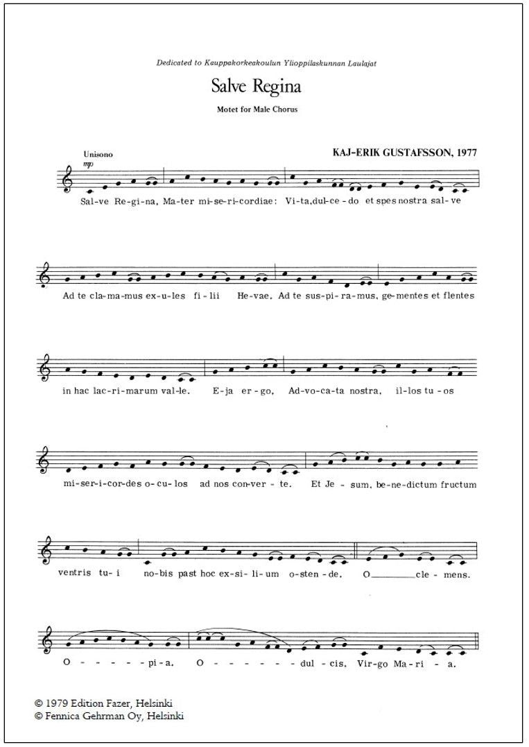 Kaj-Erik Gustafsson is a Finnish organist and choral conductor who has also written vocal and organ works. His motet Salve Regina (1977) begins with a plainchant introduction. This then becomes the subject for variation in a style which pays homage to the melody's archaic origins. Text: Bible (La... Lue lisää