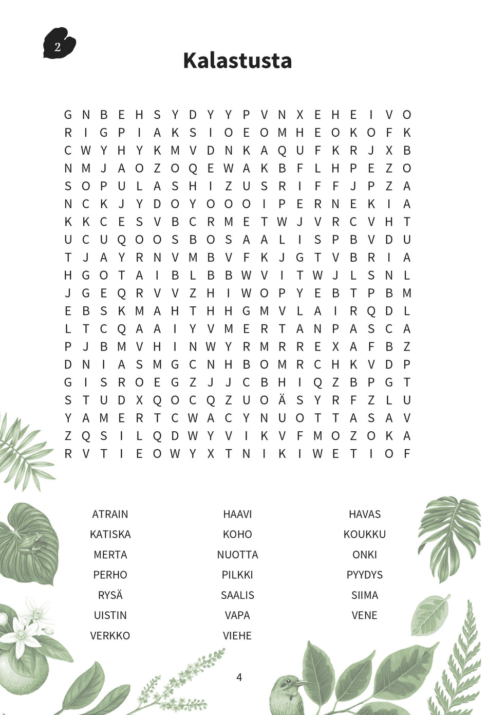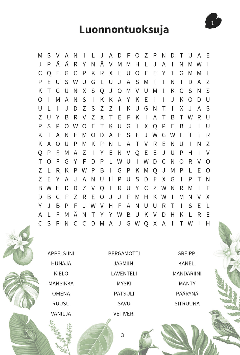 Sanasokkeloita seesteisiin hetkiin. Ruudukoissa on sanoja eri teemoista ja tunnelmista. Hurmaava kansi.
