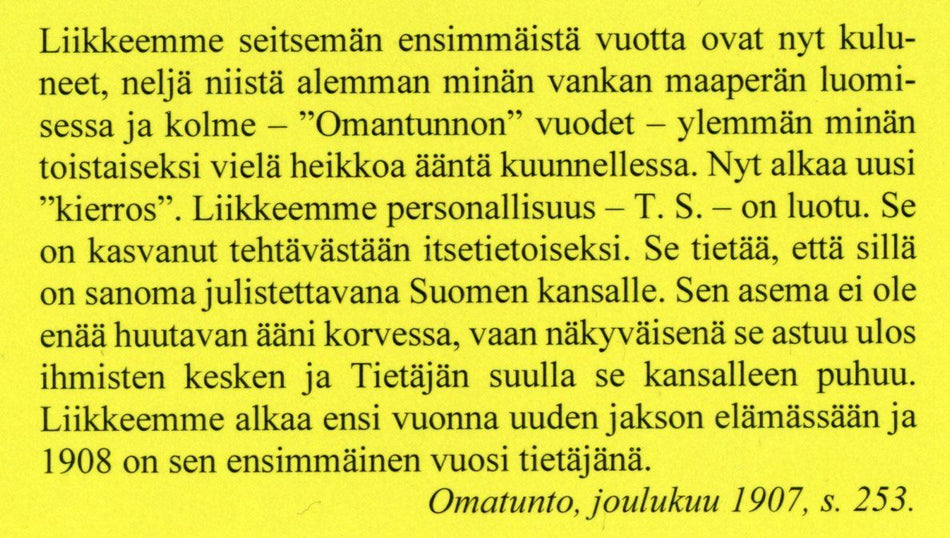 Omatunto 1907, s. 253: ”Liikkeemme seitsemän ensimmäistä vuotta ovat nyt kuluneet, neljä niistä alemman minän vankan maaperän luomisessa ja kolme – 'Omantunnon' vuodet – ylemmän minän toistaiseksi vielä heikkoa ääntä kuunnellessa. Nyt alkaa uusi 'kierros'. Liikkeemme personallisuus – T. S. – on luotu. Se on kasvanut tehtävästään itsetietoiseksi. Se tietää, että sillä on sanoma julistettavana Suomen kansalle. Sen asema ei ole enää huutavan ääni korvessa, vaan näkyväisenä se astuu ulos ihmisten kesken ja Tietäjän suulla se kansalleen puhuu.”