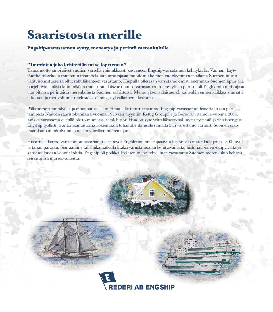 Saaristosta merille. Engship-varustamon synty, menestys ja perintö merenkululle -historiikki ilmestyy syksyllä 2023, jolloin tulee kuluneeksi 50 vuotta Rederi Ab Engship -varustamon perustamisesta vuonna 1973.