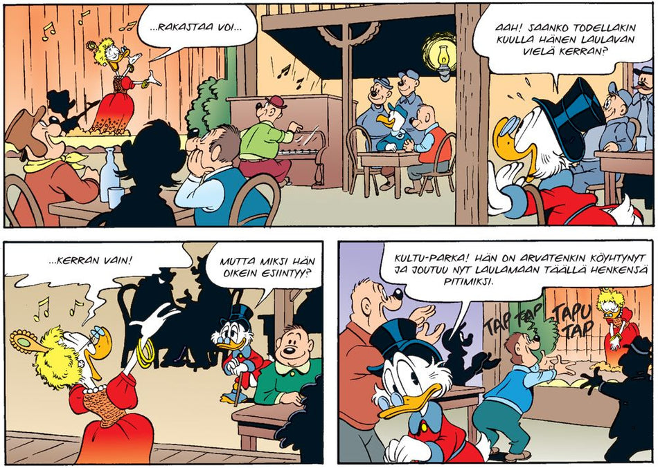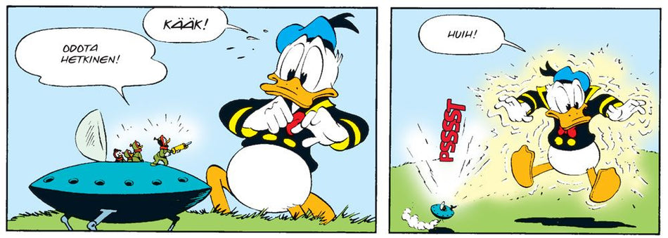 Pitkän uransa aikana Vicar ehti laatia jatkoa monille Carl Barksin klassikkotarinoille: kokoelman nimikertomus "Avaruusankkojen paluu" tutustuttaa Akun ja kumppanit jälleen piskuisiin avaruusmuukalaisiin. Kultu Kimallus puolestaan palaa kuvioihin kertomuksessa "Alaskan öljylöytö", ja "MacAaveen linna" vie Roopen takaisin Skotlannin maisemiin.