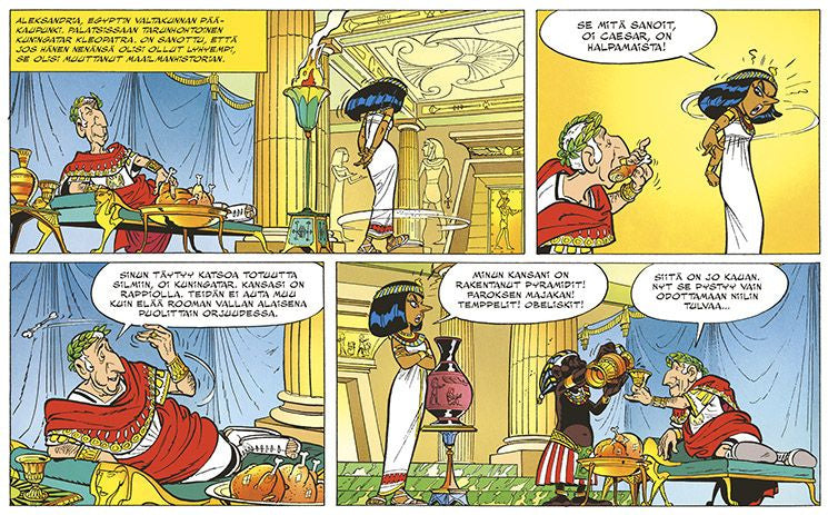 Kleopatra on pulassa, sillä Rooma uhkaa Egyptiä! Kaunisnenäinen hallitsijatar haastaa Caesarin, mutta ilman Asterixin, Obelixin ja Akvavitixin apua tappio on varma! Vaan miten mahtavat gallialaiset pärjätä Egyptin korventavan auringon alla? Lue lisää