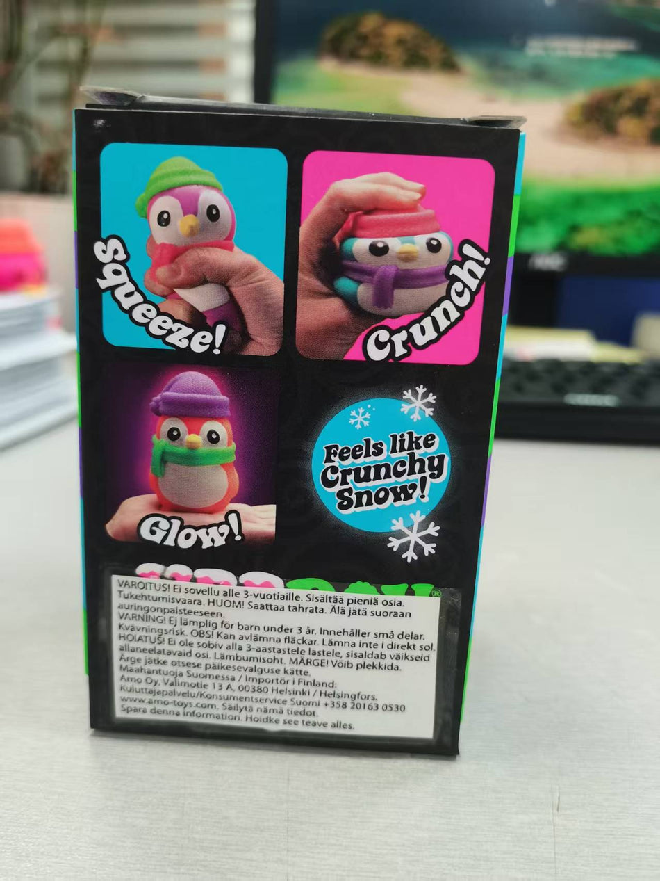 Pehmeä ja puristeltava talvinen pingviini, joka hohtaa pimeässä ja puristeltaessa narskuu kuin lumi. Lue lisää
