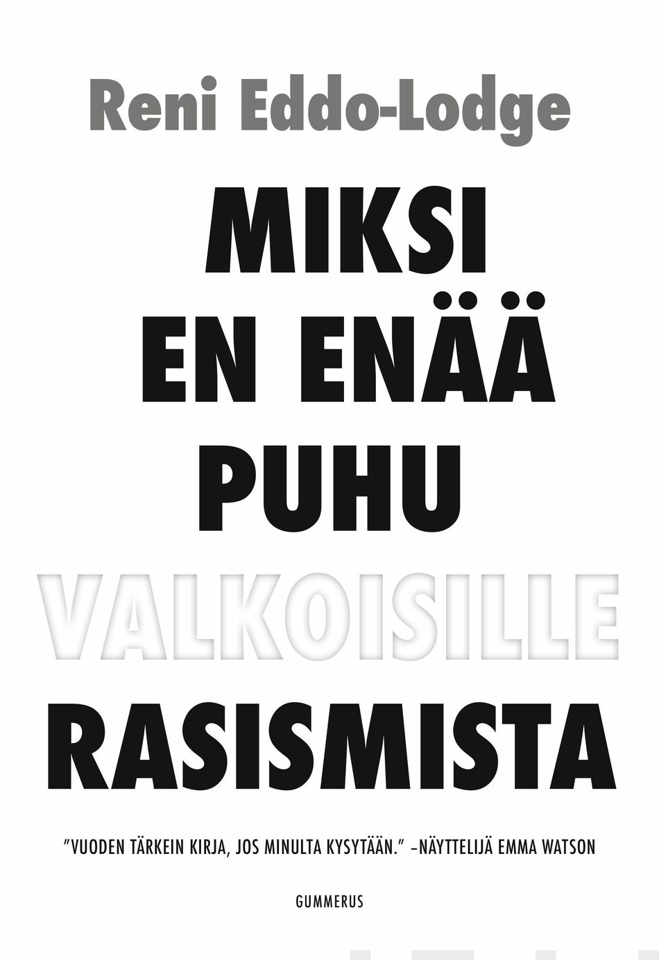 Kun samanniminen kirja julkaistiin pari vuotta myöhemmin, se käynnisti rasismista uudenlaisen keskustelun Isossa-Britanniassa. Teoksessaan Eddo-Lodge tarkastelee mustien historian häivyttämistä, luokan ja rodullisuuden yhteyttä, valkoisten etuoikeutettua asemaa, monikulttuurisuuden pelkoa sekä valkoista feminismiä. Se on käsikirja jokaiselle, joka haluaa ymmärtää, miltä rasismi näyttää, miten sen tunnistaa ja miten sitä vastaan voi toimia.