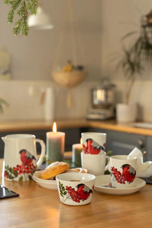 Valkoinen posliinikippo jonka kyljessä on kaunis punatulkun kuva. Kestää mikron ja uunin. Kippoon mahtuu sisään muovinen kermaviilipurkki, joten kippoa voi käyttää dippikuppina. Lue lisää