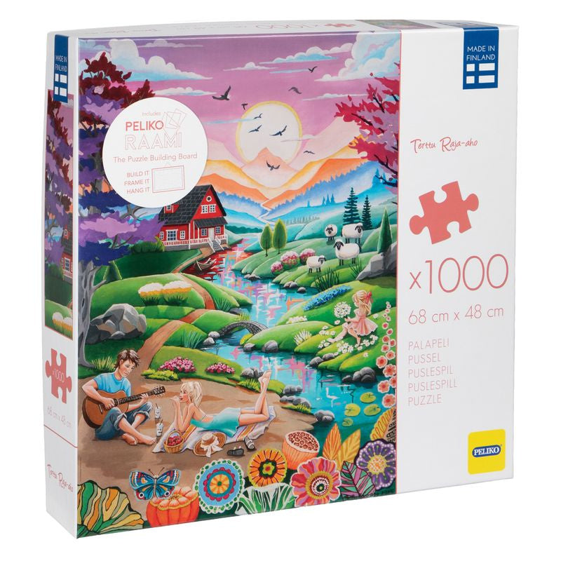 Suomalaisen taiteilijan Terttu Raja-Ahon luoma upea ja tunnelmallinen kuva 1000 palan palapelissä. Kuvassa nuori pari nauttii lämpimästä kesäillasta kitaran soidessa. Valmiin palapelin koko on 68 x 48 cm. Pelikon palapelit valmistetaan Suomessa kierrätyskartongista, aurinkoenergian voimalla tuotetulla sähköllä. Sisältää Peliko Raamin – kokoamisalustan, jonka avulla palapeli on helppo koota ja kehystää mihin tahansa standardikokoiseen 50 x 70 cm kehykseen.