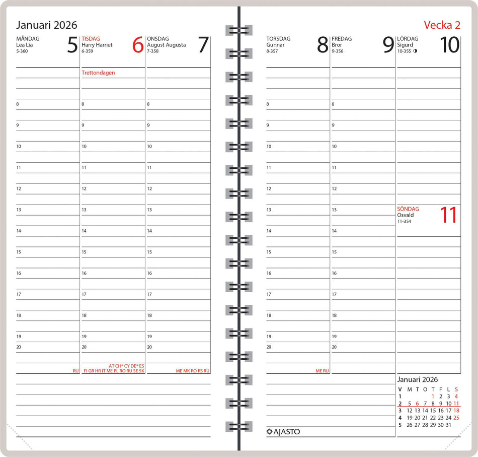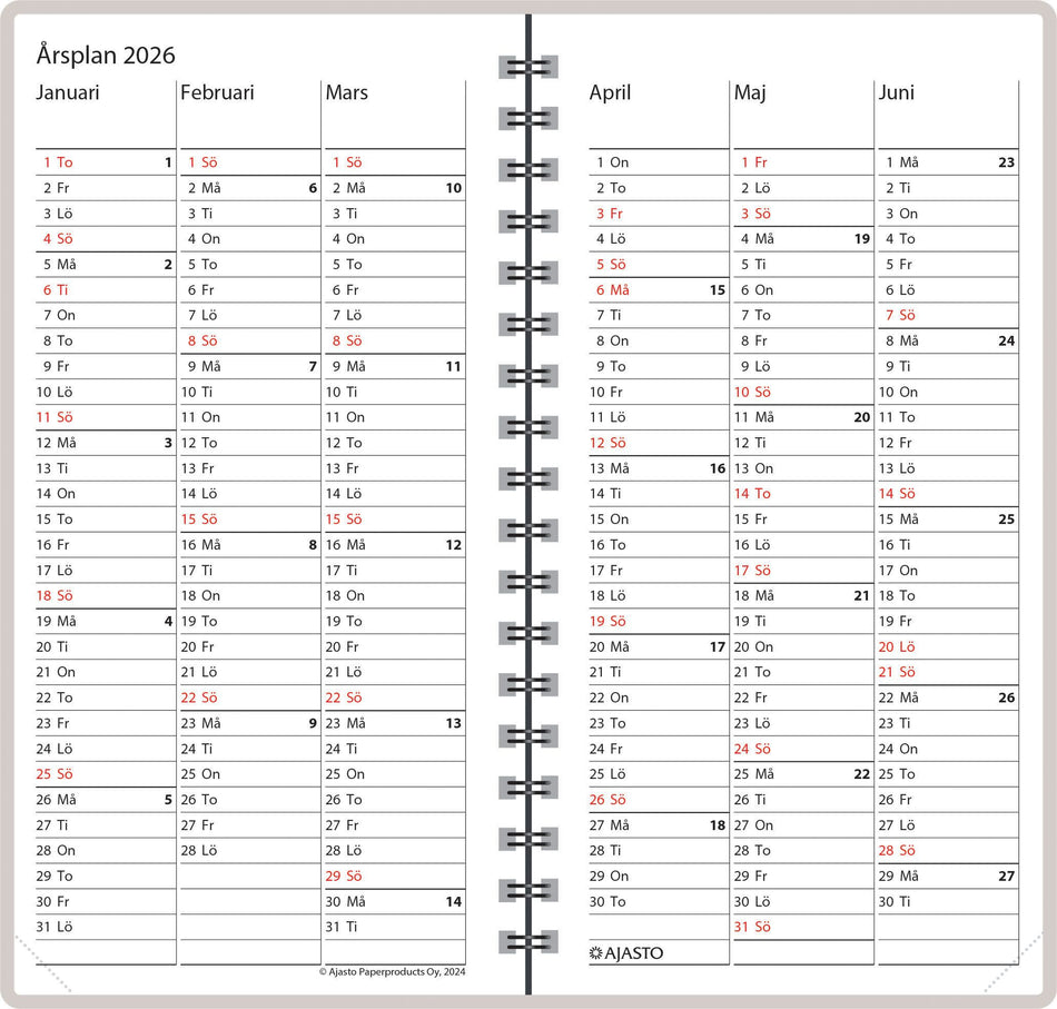 Storlek 85 x 162 mm; leatherette-pärmar; wire-o-bunden; en vecka per uppslag; dagbok 48/2025–1/2027; årsplaner 2026 och 2027; nationella helgdagar; namnsdagar; Europaskarta; pennhållare; Nyckelflagga-produkt; FSC®-sertifierad produkt. Lue lisää