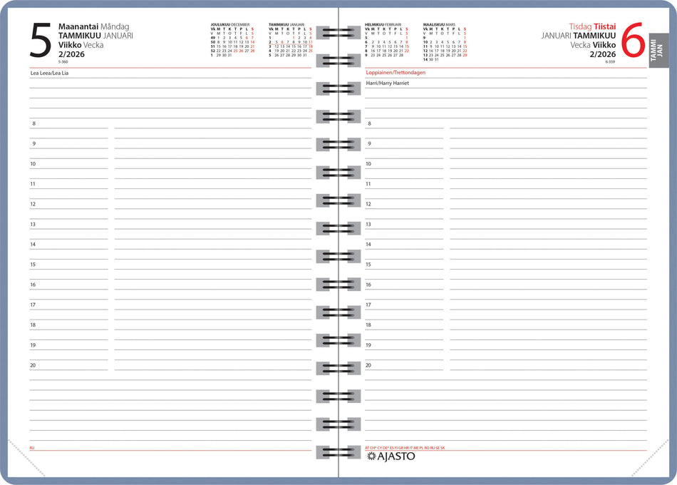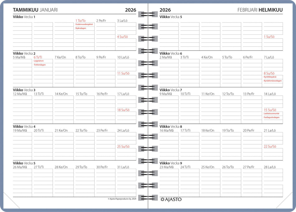 Koko 148 x 210 mm (A5); parikierresidottu; kielisyys: suomi, ruotsi; sivulla päivänäkymä; päiväkirja 52/2025–53/2026; vuosisuunnitelmat 2026 ja 2027; kansalliset vapaapäivät; suomalaiset ja suomenruotsalaiset nimipäivät; välimatkataulukko; muistiinpanosivuja; kynänpidike; FSC®-sertifioitu tuote. Lue lisää