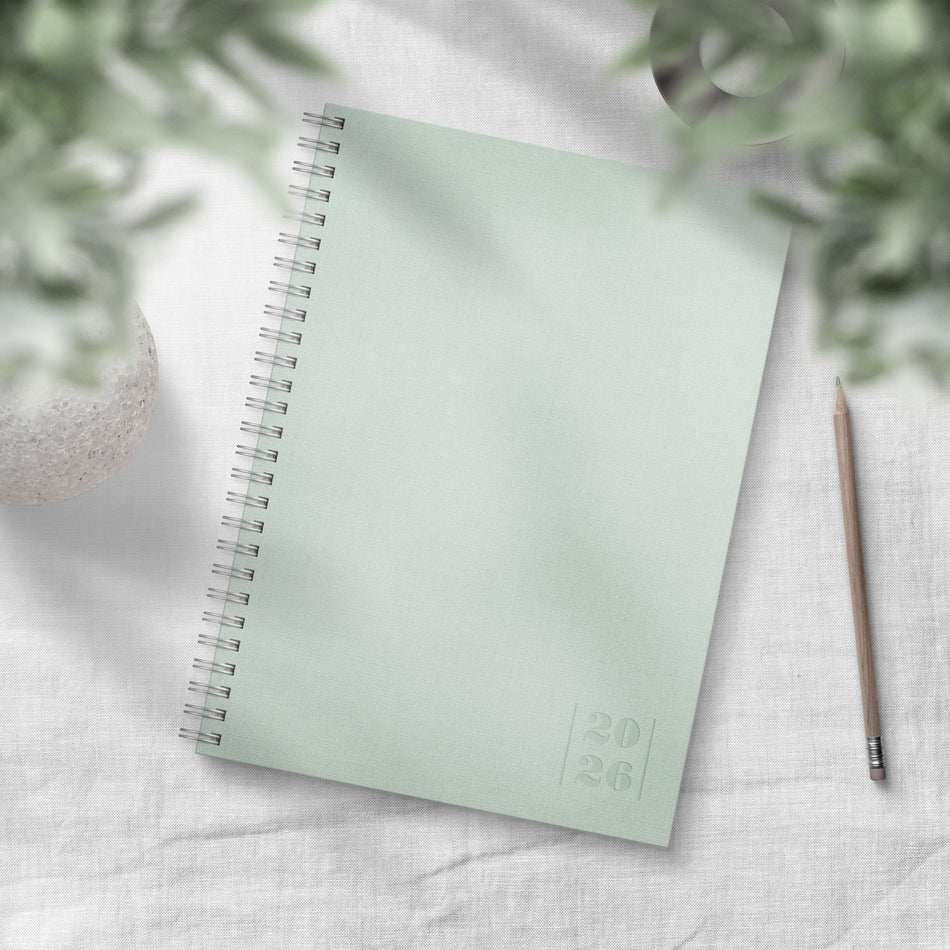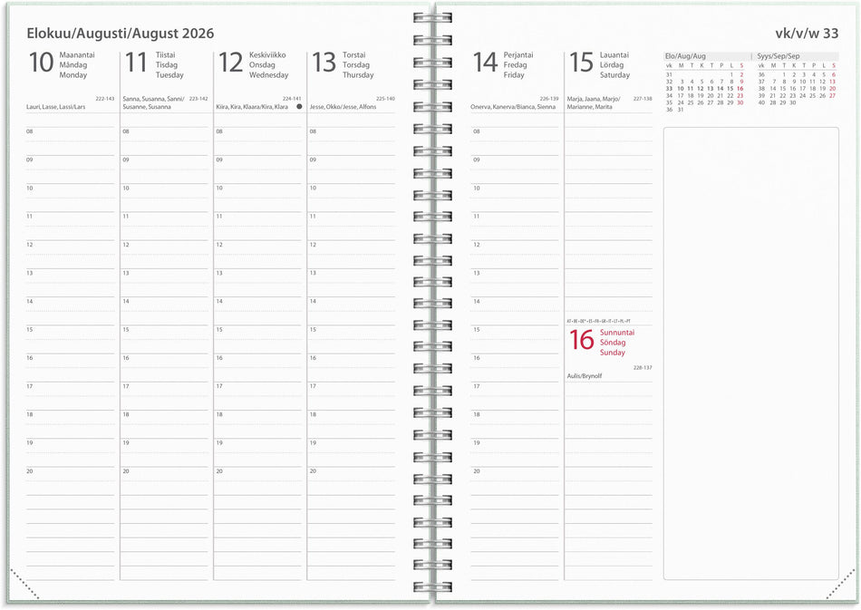 Pellavatekstiilikansi. Kalenterin aukeamalla yksi viikko, tuntijaotus 08-20, palsta muistiinpanoille, kuluvan ja seuraavan kuukauden kalenteritaulukot. Kalenteri sisältää nimipäivät, juhlapyhät, liputuspäivät, kuun vaiheet, vuosisuunnitelmat kuluvalle ja seuraavalle vuodelle, vuosiruudukot edelli... Lue lisää