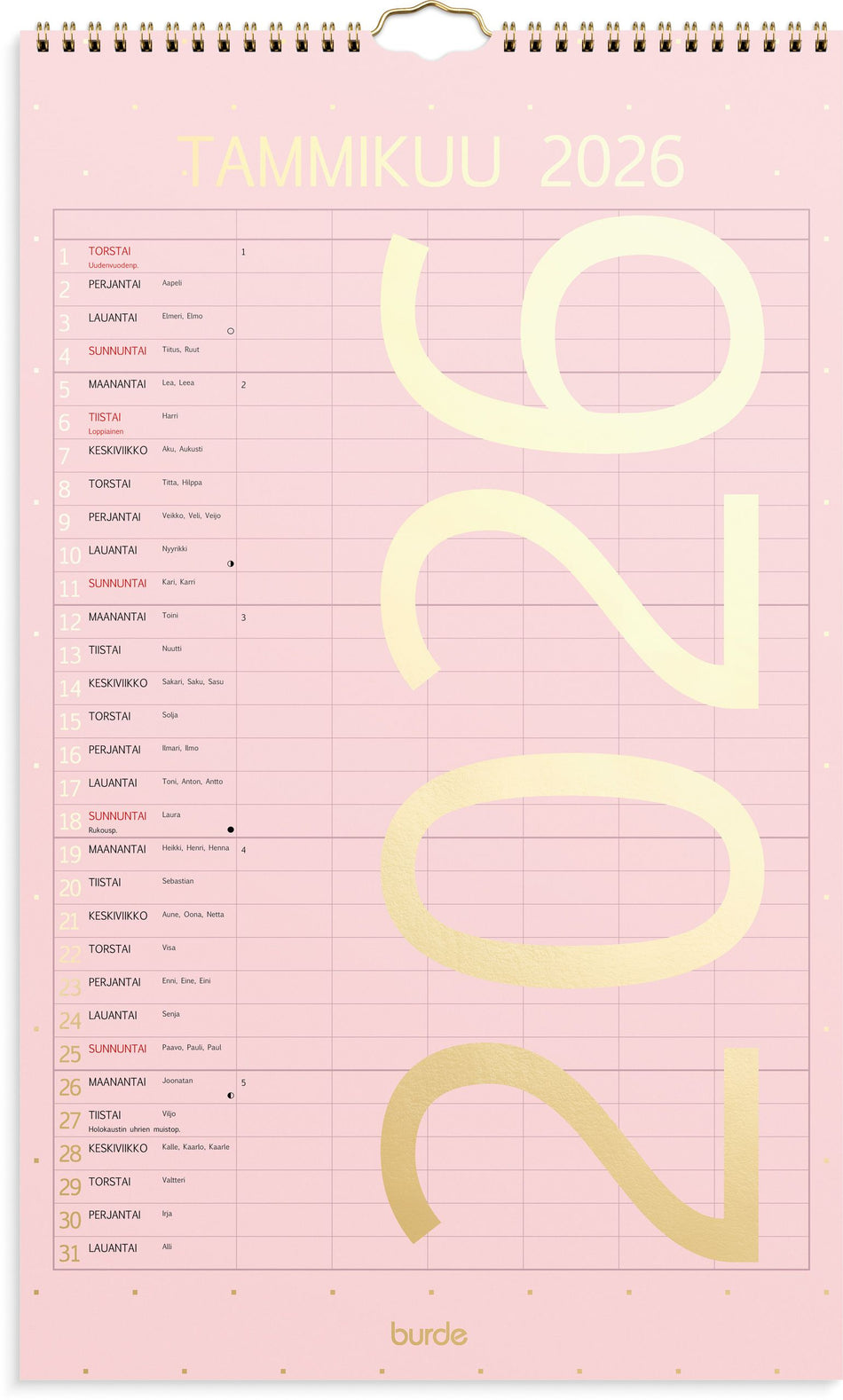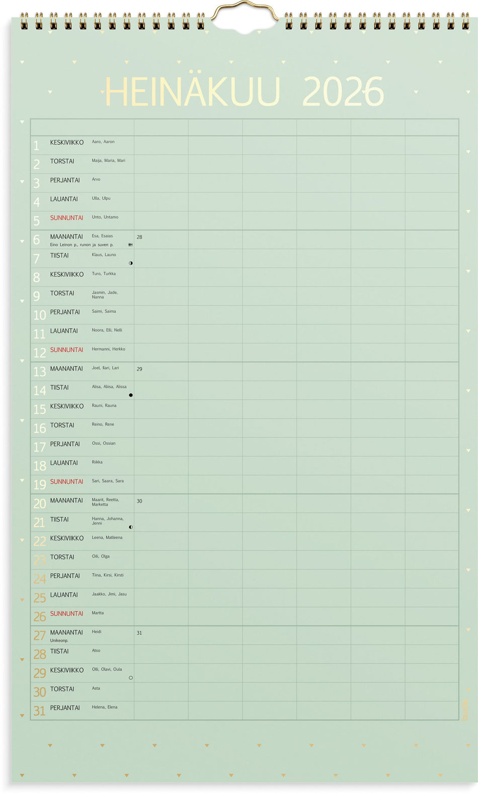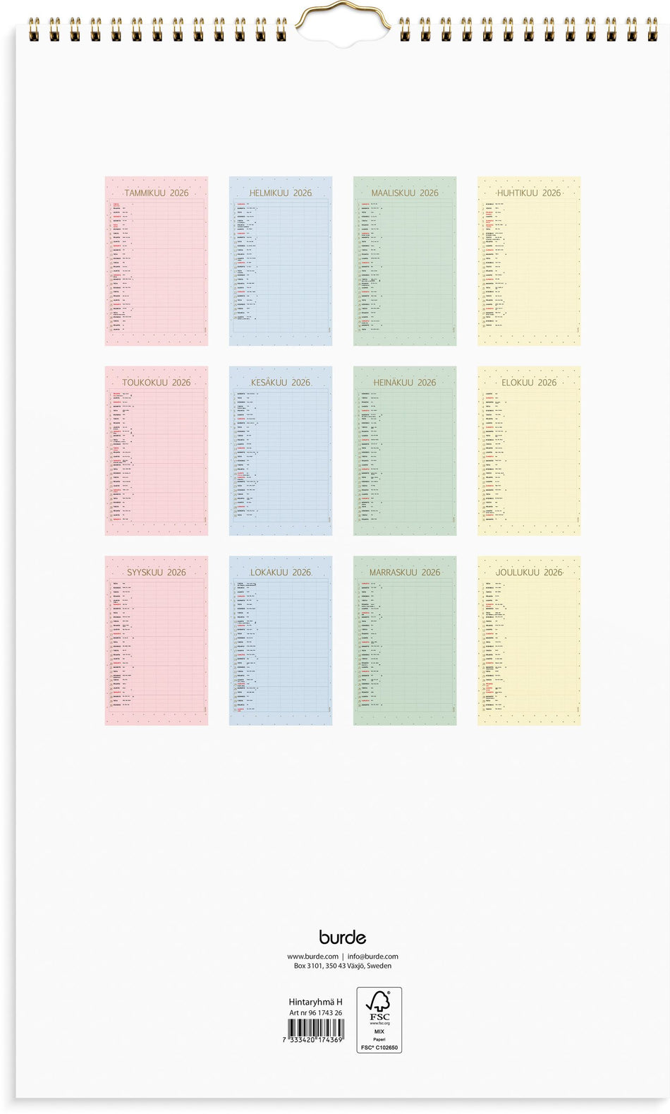 Seinäkalenteri pastellinvärisillä sivuilla ja kultapainatuksella. Jokaisella aukeamalla yksi kuukausi ja kuusi saraketta. Kalenteri sisältää nimipäivät, liputuspäivät, juhlapyhät ja kuun vaiheet. Suomenkielinen. Parikierresidottu. FSC®. Koko: 250x410 mm. Lue lisää