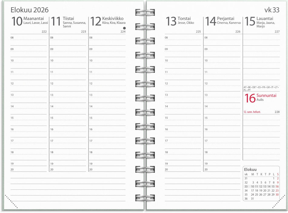 Pellavatekstiilikansi. Kalenterin aukeamalla yksi viikko, tuntijaotus 08-20 ja kuluvan kuukauden kalenteritaulukko. Kalenteri sisältää nimipäivät, kansalliset pyhäpäivät, liputuspäivät, kuun vaiheet, kalendaariset tiedot, vuosisuunnitelmat kuluvalle ja seuraavalle vuodelle, vuosiruudukot kuluvall... Lue lisää