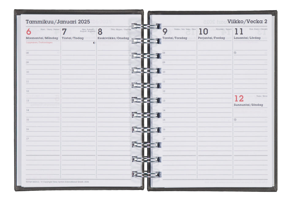 Miellyttävän tuntuiset kovat keinonahkakannet ja parikierresidonta. 18kk laajuinen viikko/aukeama sisältö, joka alkaa kesästä 2025 jatkuen aina vuoden 2026 loppuun saakka. Kaksikielinen: suomi ja ruotsi. Sisältönä mm. vuosikalenteri, lukujärjestys, koetulokset, tehtäväsivut, nimipäivät, avattava ... Lue lisää