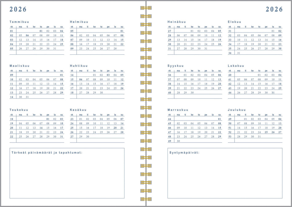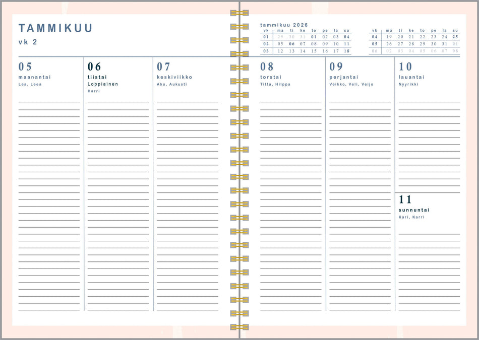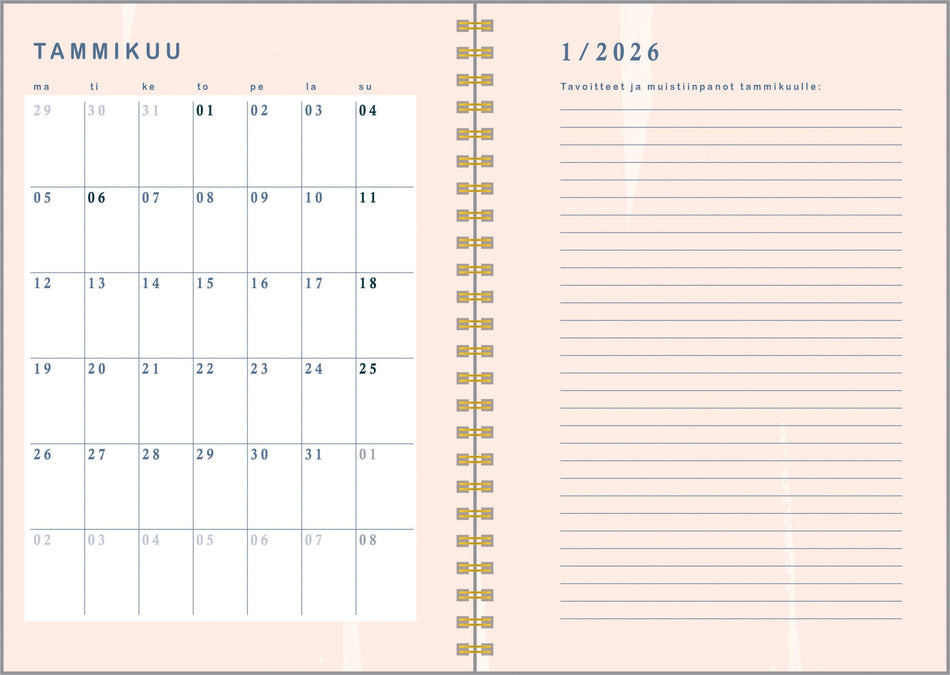 Koko 148 x 210 mm (A5); parikierresidottu; kartonkikannet; aukeamalla selkeä viikkonäkymä; päiväkirja 1/2026 - 1/2027; liputuspäivät Suomessa; suomalaiset nimipäivät; runsaasti muistiinpanotilaa; joka kuukauden alussa tilaa tärkeille päivämäärille ja tavoitteille; FSC®-sertifioitu tuote. Lue lisää