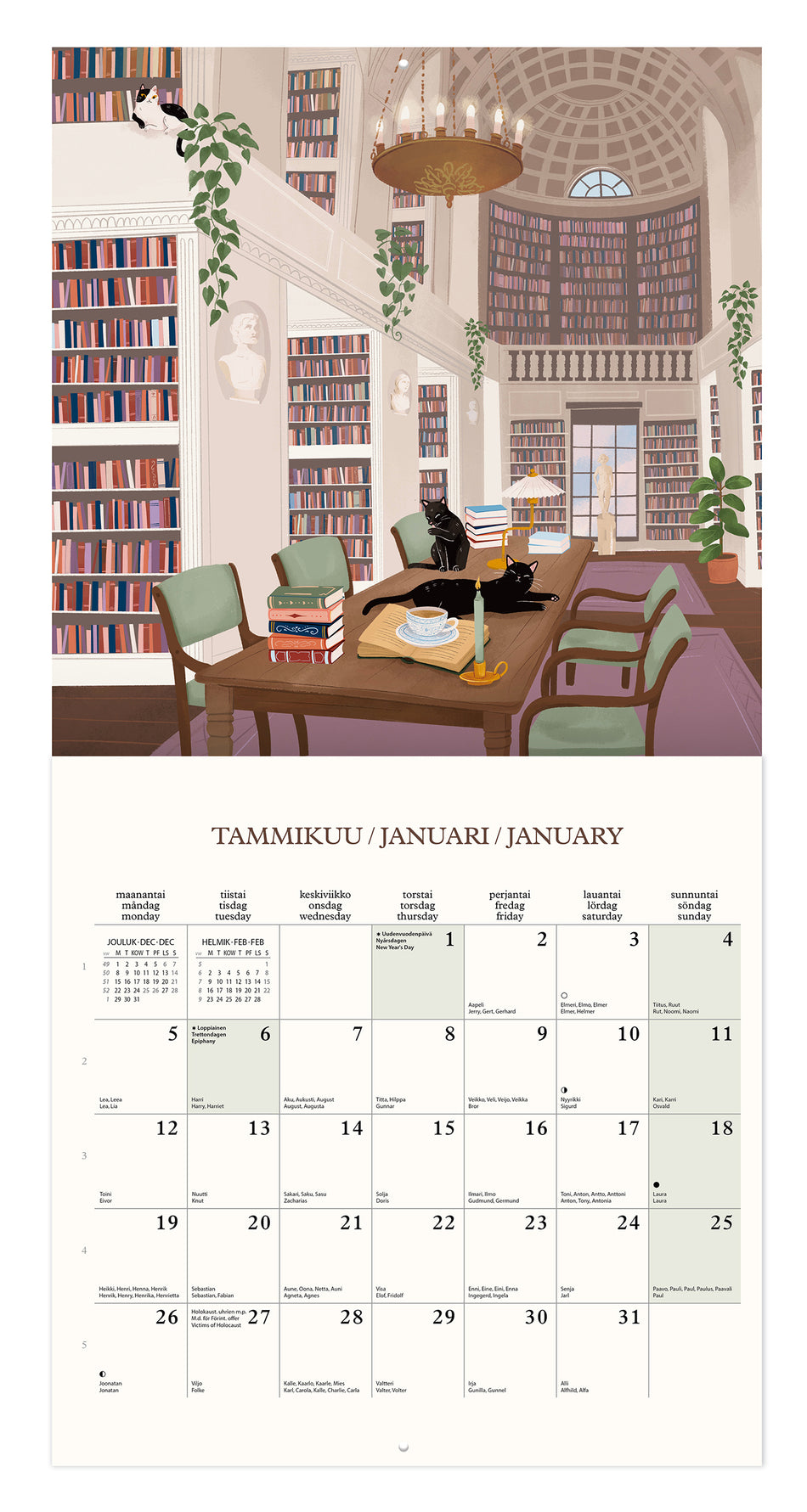 Kaisu Sandbergin 2026 seinäkalenteri ihastuttavilla kuvituksilla. Kalenterin koko on 30x30cm ja se on kolmikielinen. Se sisältää suomalaiset ja suomenruotsalaiset liputuspäivät, sekä kuun vaiheet. Tämän voi ottaa jo käyttöön lokakuussa 2025! Lue lisää