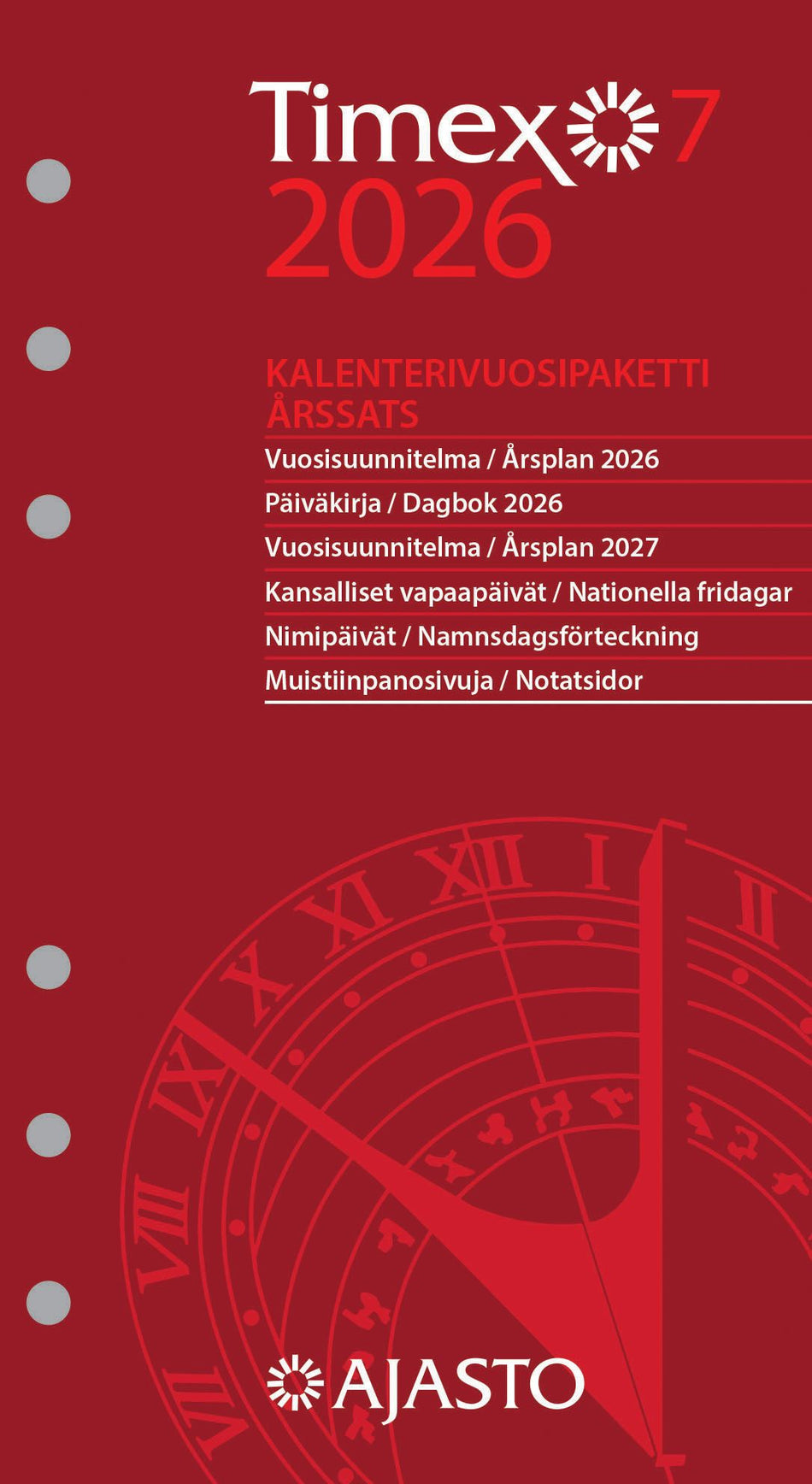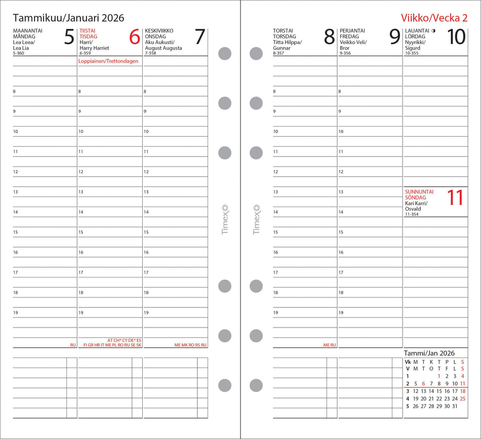 Koko 92 x 168 mm; kielisyys: suomi, ruotsi; aukeamalla pystyviikko; päiväkirja 52/2025–1/2027; vuosisuunnitelmat 2026 ja 2027; suomalaiset ja suomenruotsalaiset nimipäivät; kansalliset vapaapäivät; FSC®-sertifioitu tuote. Lue lisää