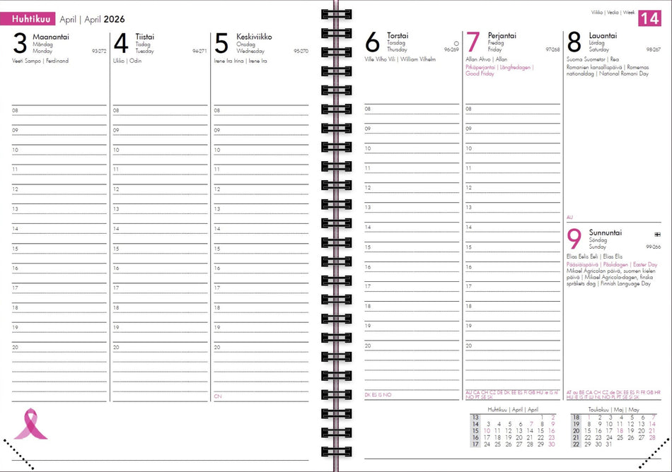 Hieno Roosa nauha A5 kalenteri viikkoaukeamalla ja kuvioiduilla keinonahkakansilla. Monipuolinen sisältö. Kolmikielinen: suomi, ruotsi ja englanti. Myyntituotosta 10% syövän vastaiseen taisteluun. Valmistettu FSC-sertifioidusta paperista. Lue lisää