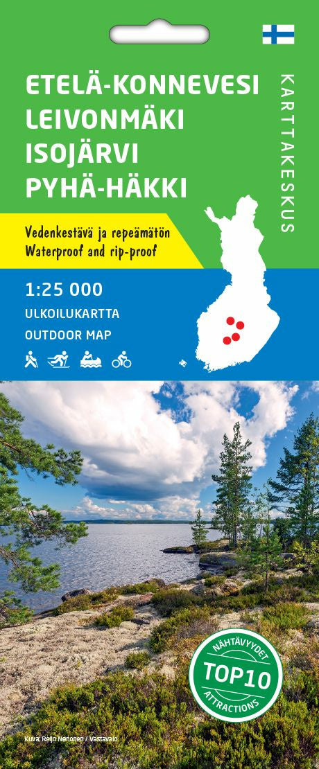 Ulkoilukartta Etelä-Konnevesi Leivonmäki Isojärvi Pyhä-Häkki 1:25 000 kattaa neljä Keski-Suomen kansallispuistoa yhdellä kaksipuolisella kartta-arkilla. Kartta on painettu kestävälle synteettiselle materiaalille ja pakattu pahvikoteloon. Vedenkestävät kotimaiset ulkoilukartat tunnistaa kannen kel... Lue lisää