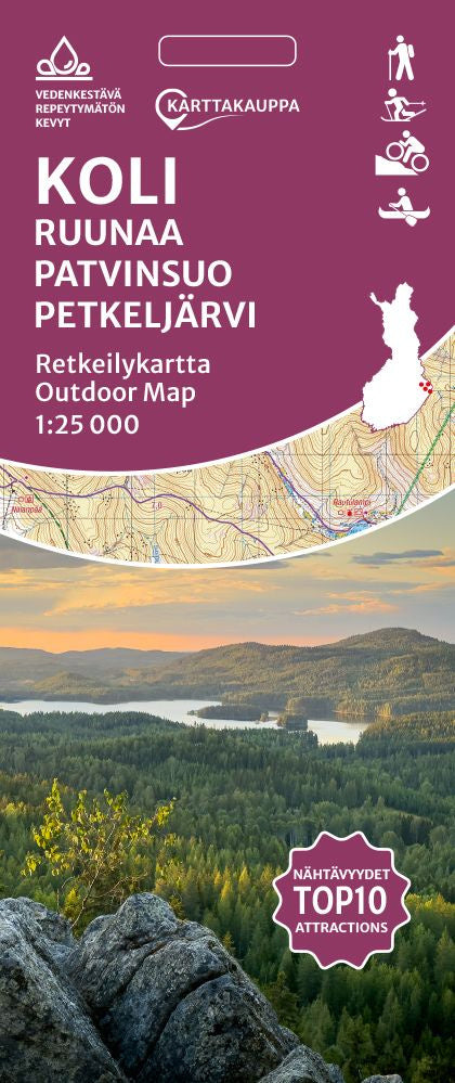 Koli, Ruunaa, Patvinsuo, Petkeljärvi retkeilykartta on upea paketti Itä-Suomen retkeilykohteisiin. Neljän hienon kohteen kartat ovat jokainen mittakaavassa 1:25 000 (1 cm kartalla vastaa 250 metriä maastossa). Kolin, Patvinsuon ja Petkeljärven kansallispuistot esitetään kartoilla kokonaan. Ruunaan retkeilyalueen keskeisimpien osien lisäksi kartalla on myös Ruunaanjärvi. Kartta soveltuu erinomaisesti myös melojille.