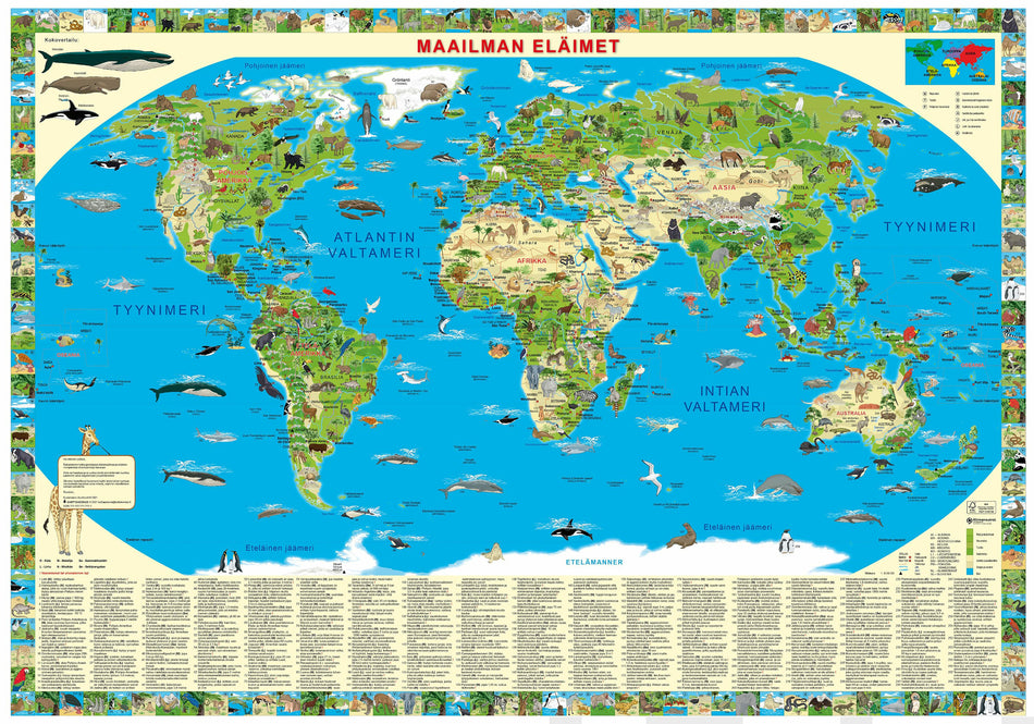 Jokaisen eläimen kuvatekstit kertovat yllättäviä tietoja eläinmaailman tavoista ja ennätyksistä. Pohjakarttaan on merkitty maailman valtiot pääkaupunkeineen. Kartta toimii hyvin lastenhuoneen katseenvangitsijana ja sen kiiltäväpintainen materiaali kestää kevyttä kostealla pyyhkimistä. Kartta on pakattu pahviputkeen.