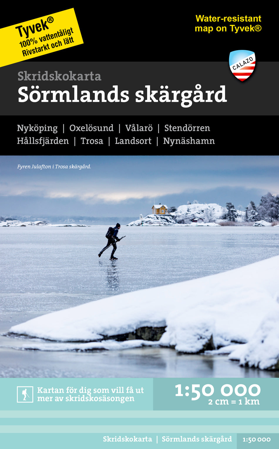 Skridskokartan över Sörmlands skärgård omfattar området mellan Nynäshamn och Oxelösund. Calazos skridskokartor är utvecklade i nära samarbete med Mårten Ajne, en av Sveriges mest erfarna och kunniga skridskoåkare som bland annat är författare till referensverket Stora boken om långfärdsskridsko. Mer än femtio års is- och väderdata har kombinerats med skridskoklubbarnas samlade erfarenheter för att ta fram dessa kartor.På Skridskokartan över Sörmlands skärgård står isen i centrum. Isläggningen återges med färgsatta och numrerade områden efter normal frysordning. Isbedömning underlättas med markeringar för råkar, fartygsrännor, strömställen och andra svaga områden. Färden blir enklare med rekommenderade startplatser, parkeringar och landpassager.