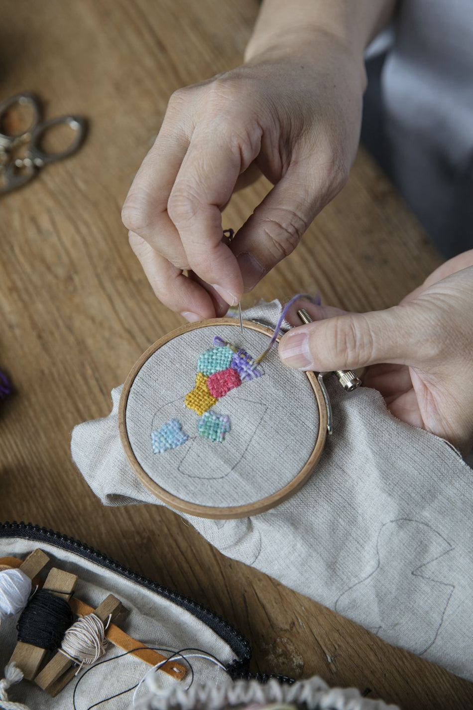 Mosaic embroidery is a technique based on simple darning stitches — all you need to get started is an embroidery hoop and some fabric, yarn, a needle and a pair of scissors! It is perfect for using even the tiniest bits of leftover yarn.