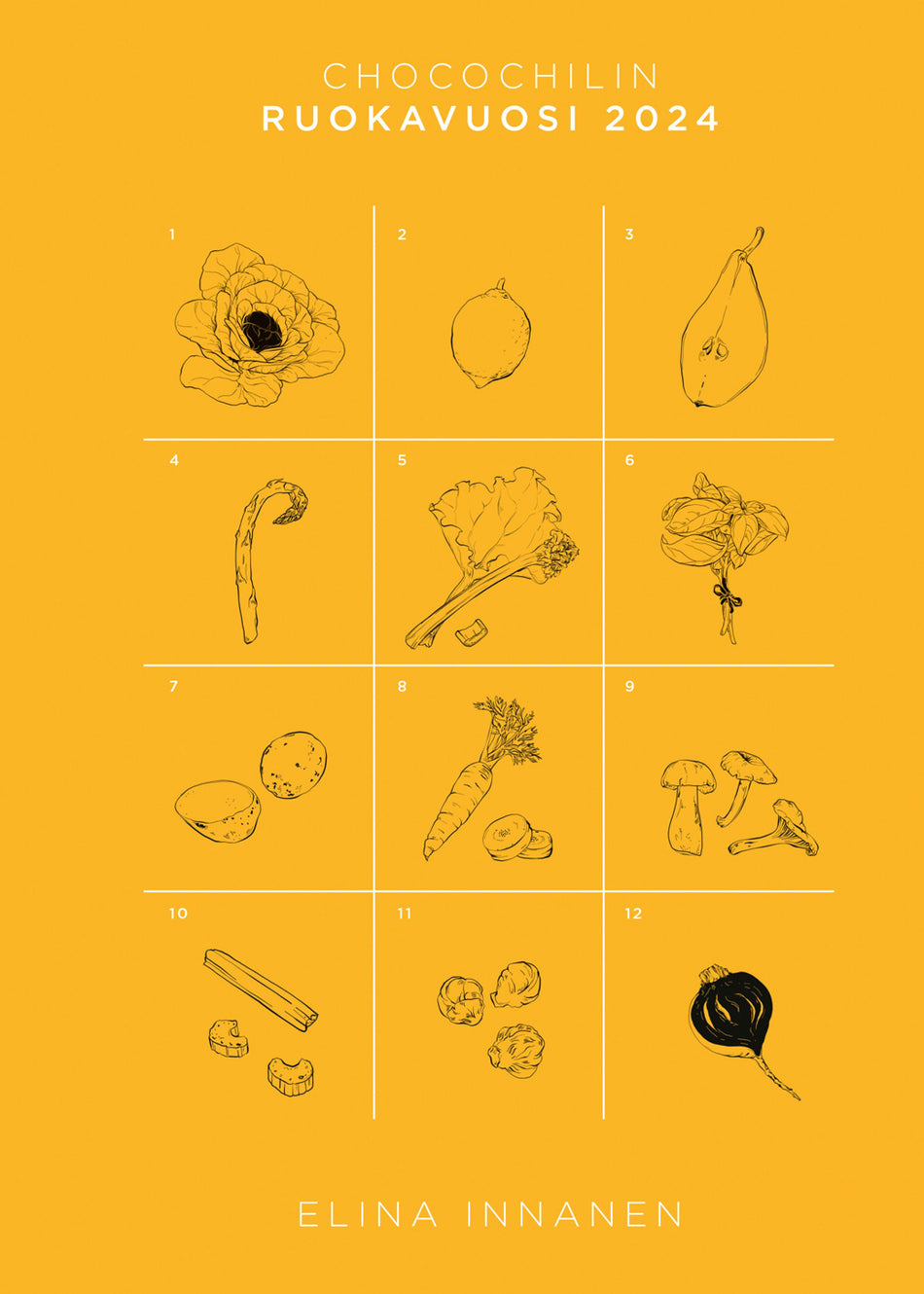 Chocochili-blogistaan ja keittokirjoistaan tunnetun Elina Innasen kalenteri auttaa arjen suunnittelussa, helpottaa ruokalistojen laatimista ja ruokaostosten tekoa sekä tarjoaa tietoa kunkin sesongin parhaista raaka-aineista. Viikko- ja kuukausinäkymien ohella kalenterista löytyy muun muassa vegaanisia reseptejä.