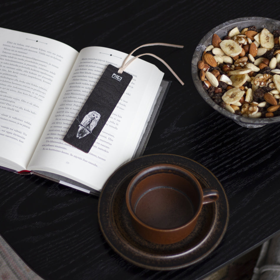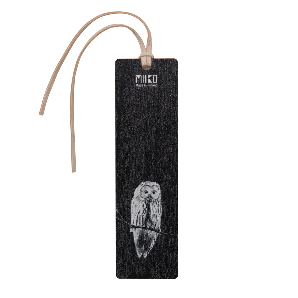 Kirjanmerkki Miiko Pöllö koivuvaneri/poronnahka 4x14cm