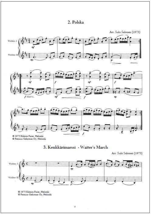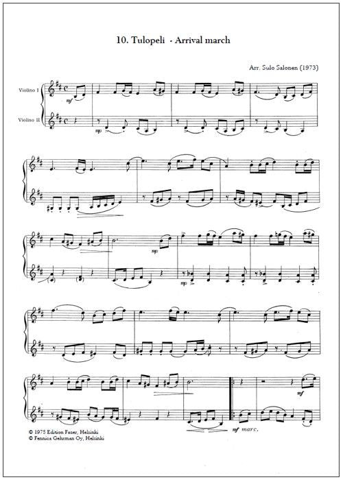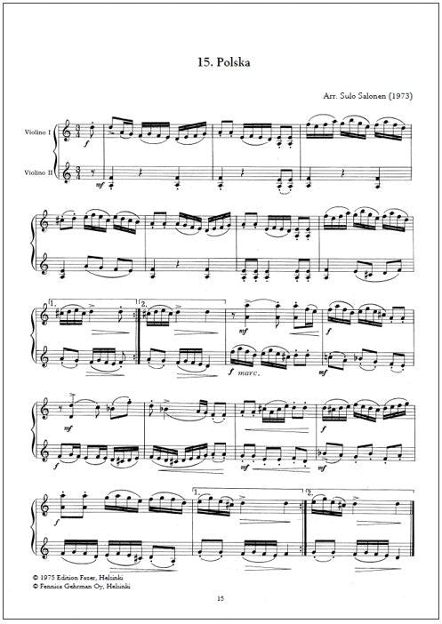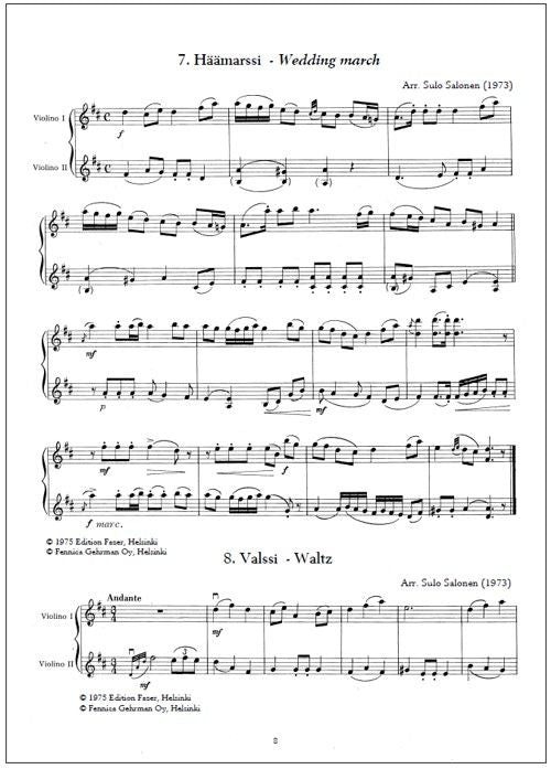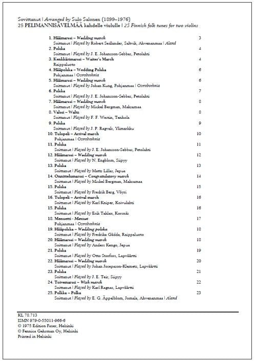 A collection of 25 fiddle tunes from western parts of Finland arranged for two violins by Finnish composer Sulo Salonen (1899-1976). Marches, polskas, and other dances played in weddings and other festivities offer lively repertoire and and a view to treasures of Finnish folk music tradition. Lue lisää