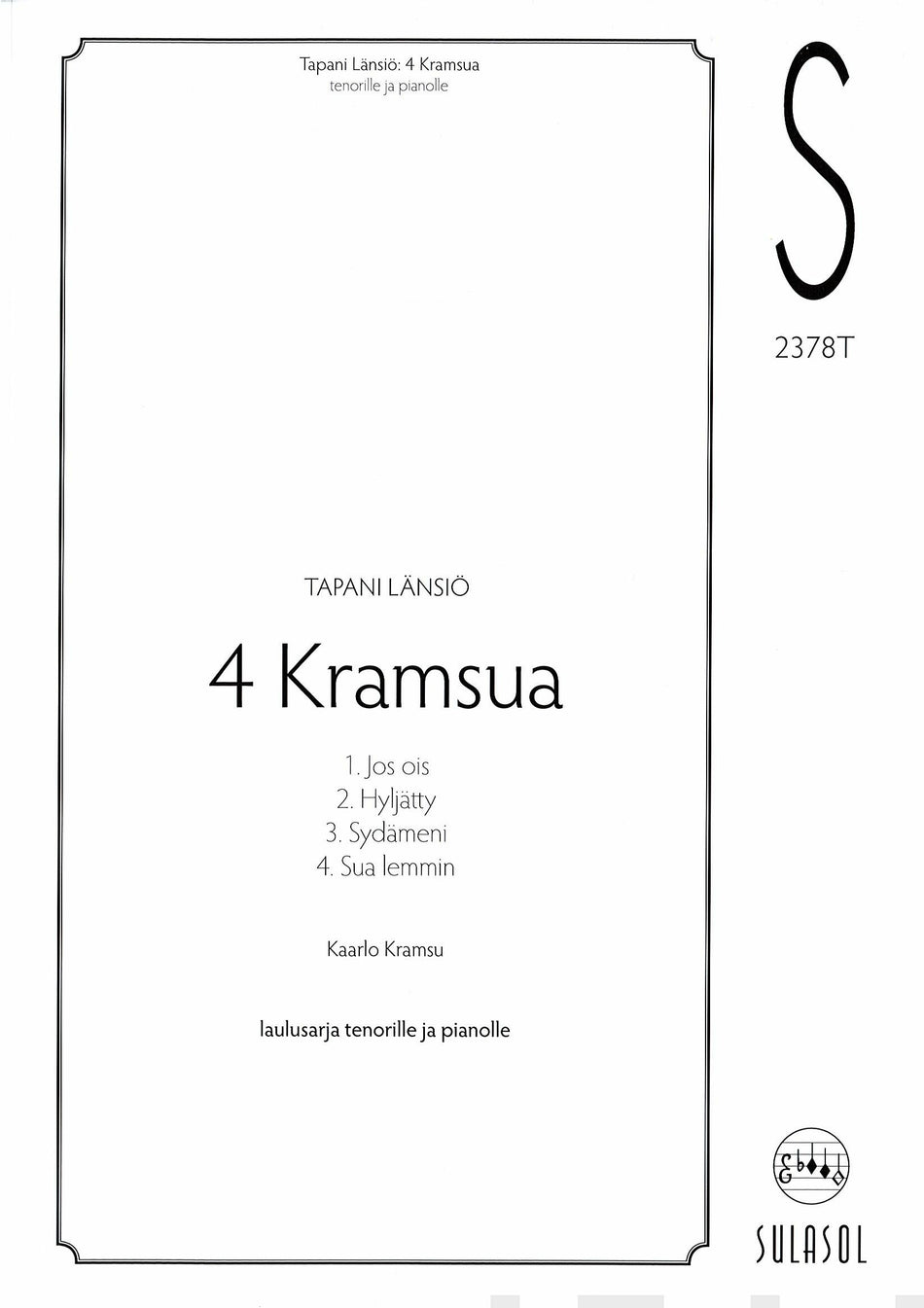 Neljä laulua Kaarlo Kramsun teksteihin. Versio tenorille ja pianolle. Lue lisää