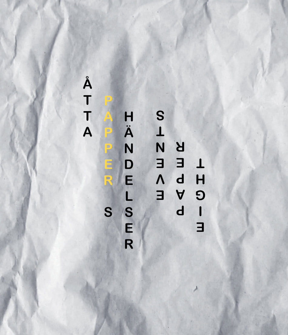 Åtta Pappershändelser är Karl-Johan Stigmarks sjunde bok och den första på förlaget Fas Publishing SE. Stigmark är konstnär och har bland flera tidigare utgivna böcker materialiserat ämnen med titlarna, Fläckar Ord, Sprickor Och Andra Sprickor och Lösa trådar. - - - - - - “Here comes an elegant and highly witty artistbook by our swedish überconceptual photographer Karl Johan Stigmark. Beautiful play with language and images, Art & Language, but also with what Freud calls the fastest shortcut to the unconscious «der Witz » (wit/le mot d’esprit/ lapsus/ etc) or what Kant would have called « the play of thought ». There would be a lot to say on how Stigmark’s humor relates to nonsense and melancholia. I sense a strong influence of Broodthaers and Yves Klein, especially when it comes to his performance by the Seine river in Paris. There are also some lovely texts at the end and a very funny poem that I’ve photographed here by our great psychoanalyst and poet UKON (Ulf Karl Olof Nilsson). “ (Sinziana Ravini, art and literature critic) - - - - - - De flesta av Karl- Johan Stigmarks konstprojekt är avsedda att upplevas i realtid, och den fotografiska dokumentation som hör till är mer att betrakta som självständiga verk, där konstnären låter bilderna och texten ingå ett symbiotiskt förhållande på en helt ny nivå. Men han har även en annan fotografisk praktik, där han vänder kameran mot de ting och områden i tillvaron som för de mesta inte bevärdigas vår blick. - - - - - - Åtta Pappershändelser är en artists´bok där materialet är producerat primärt för att visas i bokform. Boken består av åtta olika delar som alla på olika sätt gestaltar skeenden som utgår från papperets ontologi eller vara. Här kan man se visuella vackra excesser i den inledande fotografiska serien möta dokumentationen av partituret On Paper – där det akustiska av just papper gestaltas. Här kan man i en del av boken se performanceverk från Paris floder avlösas av ett dissekerande av Sartres Varat och Intet i en annan del. Det experimenteras också med olika papperskvaliteter där utvik och statements bäddas in i försätts och eftersättsbladet. - - - - - - I delen "Allt papper i min studio" är språket reducerat och utelämnat till det visuella, det vi ser eller kan förnimma bortom det kognitiva. Det finns ofta hinder i språket eller bilden som blir existentiellt oöverstigliga, men som i vardagen på ett fysiskt plan nästan alltid måste överkommas och forceras till varje pris. Eller som Stigmark skriver i boken: - - - - - - ”De sidor, pappershörn, blad, kanter, hörn, flikar, bitar, fragment, skuggor, reflektioner, avrivna, lösa, slängda, bortglömda, sparade, arkiverade, ostädade, ordnade, organiserade, undanstoppade fragment från papper synade i ljus och mörker i min studio som inte slängdes och kan ses med blotta ögat.” Boken innehåller textbidrag författade unikt för denna utgåva och med de Åtta Pappershändelserna som utgångspunkt. Emma Kihl återger poetiskt papprets vara likt en behållare för det ordnade eller bortglömda. Jesper Olsson förtätar litterära och mediahistoriska (pappers)figurer. Och i dikten Pappersrollen gestaltas jaget och detet som papper/pappor av Ulf Karl Olov Nilsson (UKON).