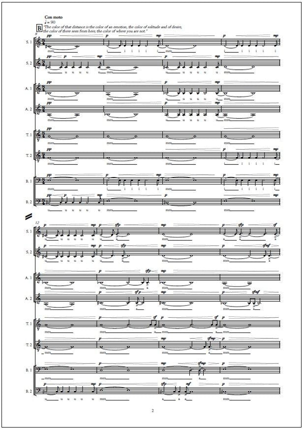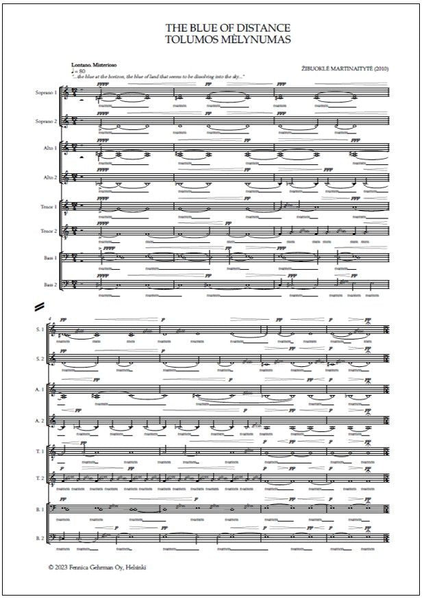 The Blue of Distance for mixed choir (SSAATTBB, no text) was composed in 2010 and premiered by Jauna Muzika with conductor Vaclovas Augustinas, on October 25, 2010 at the Gaida festival in Vilnius, Lithuania. Martinaitytė tells: When searching for the lyrics for my choral piece, I encountered an ... Lue lisää