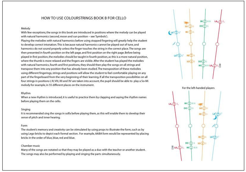 The second part of the Colourstrings Cello School is now available. It is an extensive tutor including 145 pages introducing its songs in positions where the melody can be played with natural harmonics. This will greatly help the student to develop correct intonation.