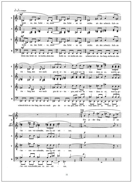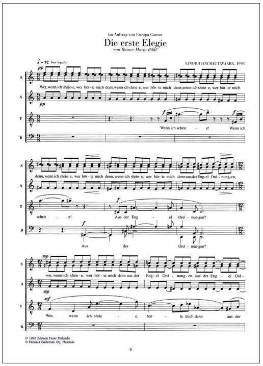 My orchestral works Angels and Visitations, Angel of Dusk and Playgrounds for Angels are all musical personifications of this figure. Only as late as 1993, however, when the international choral body 'Europa Cantat' wanted to commission a large-scale choral work from me, did I feel that the time had come to set of angel elegy. It had evidently matured in my subconscious in the interim, since the process of composing the work was swift, eager and fluently self-assured. The basic pitch material is derived from four triads which together form a twelve-note row. The way this material is applied, however, stands in considerable contrast to methods usually used for atonal music. In consequence, the tone of the work is mellow even at its most dramatic; poetic, yet expressive." (Einojuhani Rautavaara)